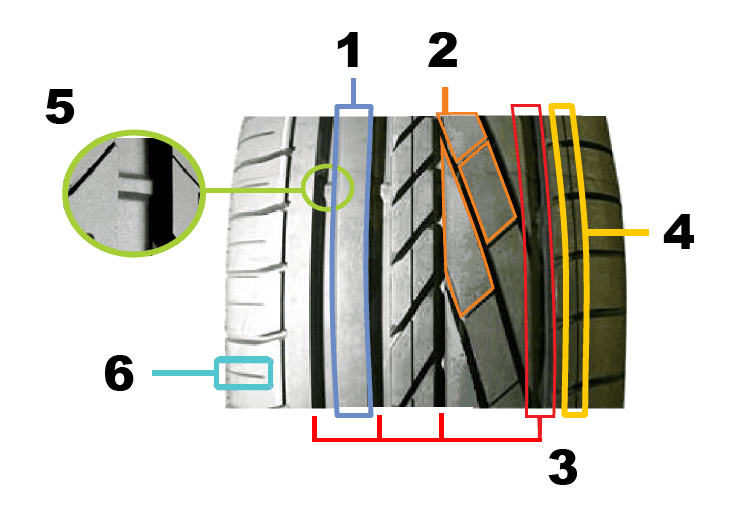5.- Indicadores de desgaste: Son pequeños topes de 2 mm de altura, se ubican en los canales centrales y nos indican el límite para cambiar el neumático.