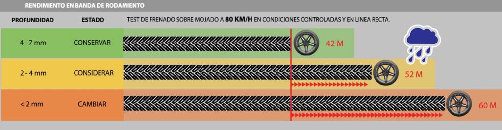 Lo que podemos interpretar de la imagen anterior es que mientras la banda de rodamiento tenga de 4 a 7mm de profundidad la llanta funcionará correctamente y la distancia en metros de frenado serán similares a los especificados por el fabricante de tu vehículo, cuando un neumático tiene menos de media vida es mejor considerar un reemplazo próximo ya que la conducción y el frenado disminuyen su eficiencia de un 15 a un 30% lo que puede hacer riesgosa la conducción; cuando una llanta tiene 2 mm o menos la capacidad de despeje de agua y funcionamiento cae al 40% o menos y el neumático es propenso a ponchaduras constantes.
