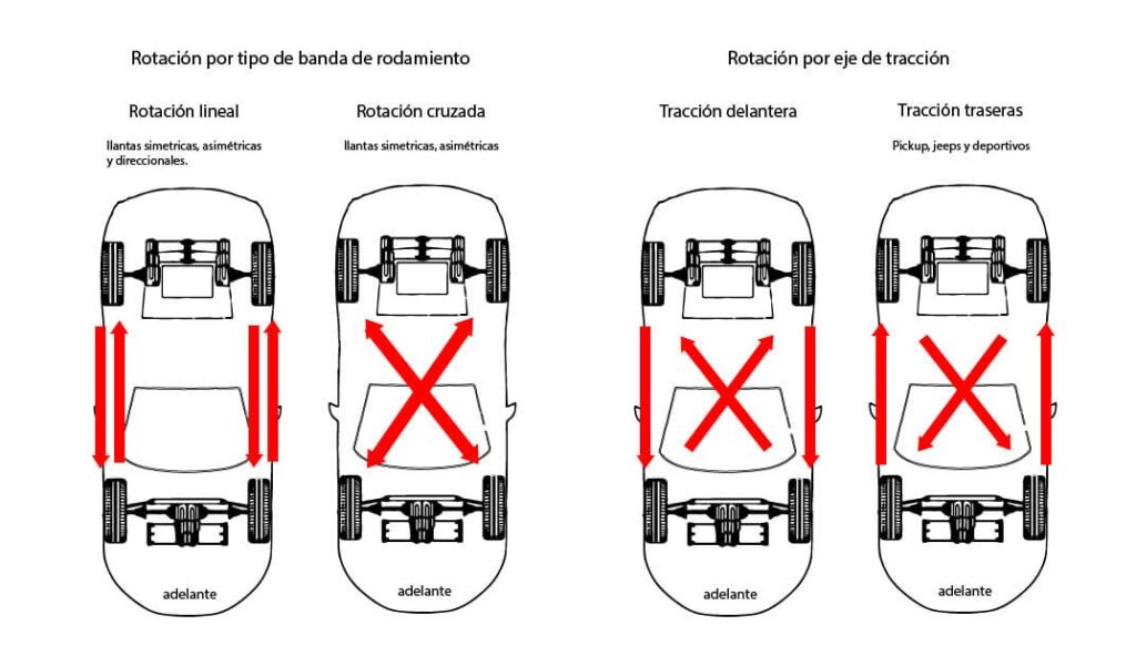 Es importante saber cómo se deben rotar los neumáticos para eso debemos saber que tipo de banda de rodamiento tiene nuestra llanta, esto se debe a que hay llantas que no se pueden pasar simplemente de un lado a otro por el sentido de giro, hay patrones actualmente que uno puede seguir para sacarles el mayor provecho a los neumáticos, otro tipo de rotación puede ser eligiendo el eje que tiene la tracción y de ahí se determina como se alternarán las llantas.
